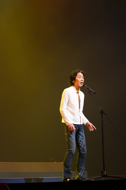 鳥ながら人肌を感じさせる芝居と、日中の壁を越えて交わった文化の妙を楽しんで頂いた第一部。ラストの舞台上には、スクリーンに映る新幹線で東下りをする赤いセーターの46年前の人見豊さんと、お客様の熱い心を背にそのスクリーンに真正面に向き合う白いセーターの現在の瞳みのるさんの姿がありました。