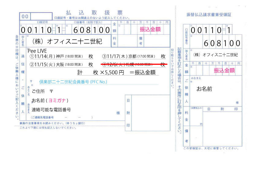 ◆通信欄の未記入や金額の過不足など、お申し込に不備がありますと、チケットをご用意できず、返金手数料を差し引いてご返金する場合があります。ご注意ください。