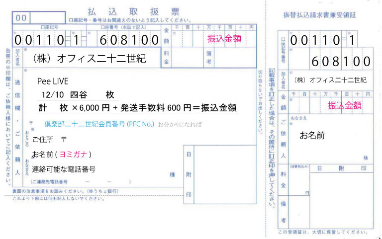 ◆通信欄の未記入や金額の過不足など、お申込みに不備がありますと、チケットをご用意できず、返金手数料を差し引いてご返金する場合があります。ご注意ください。